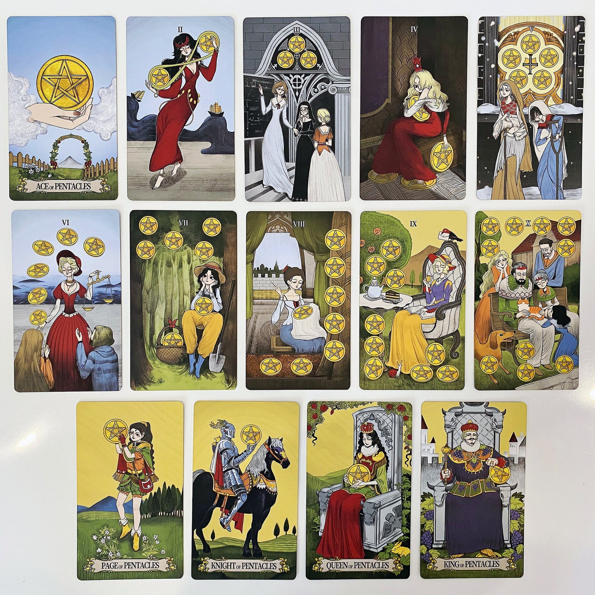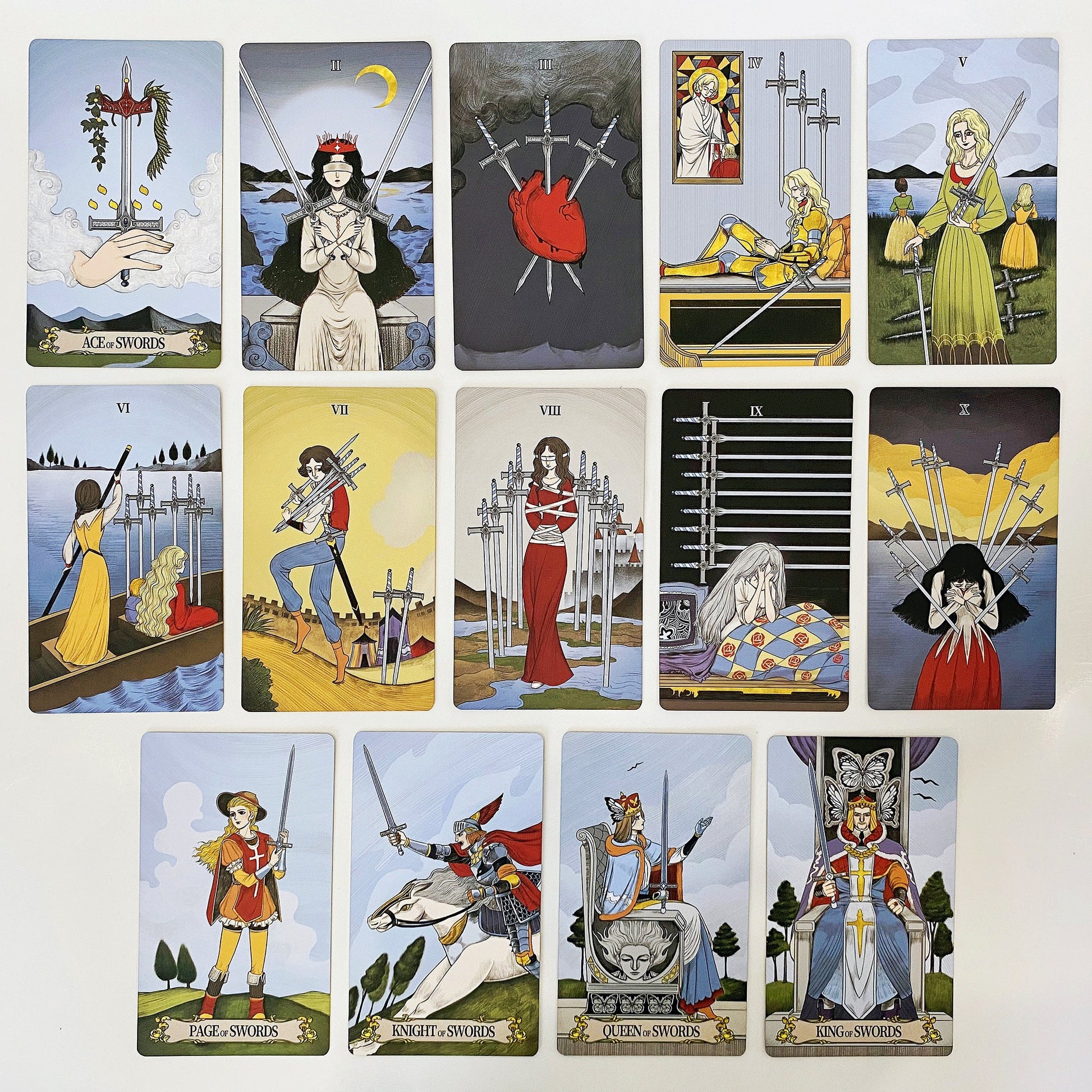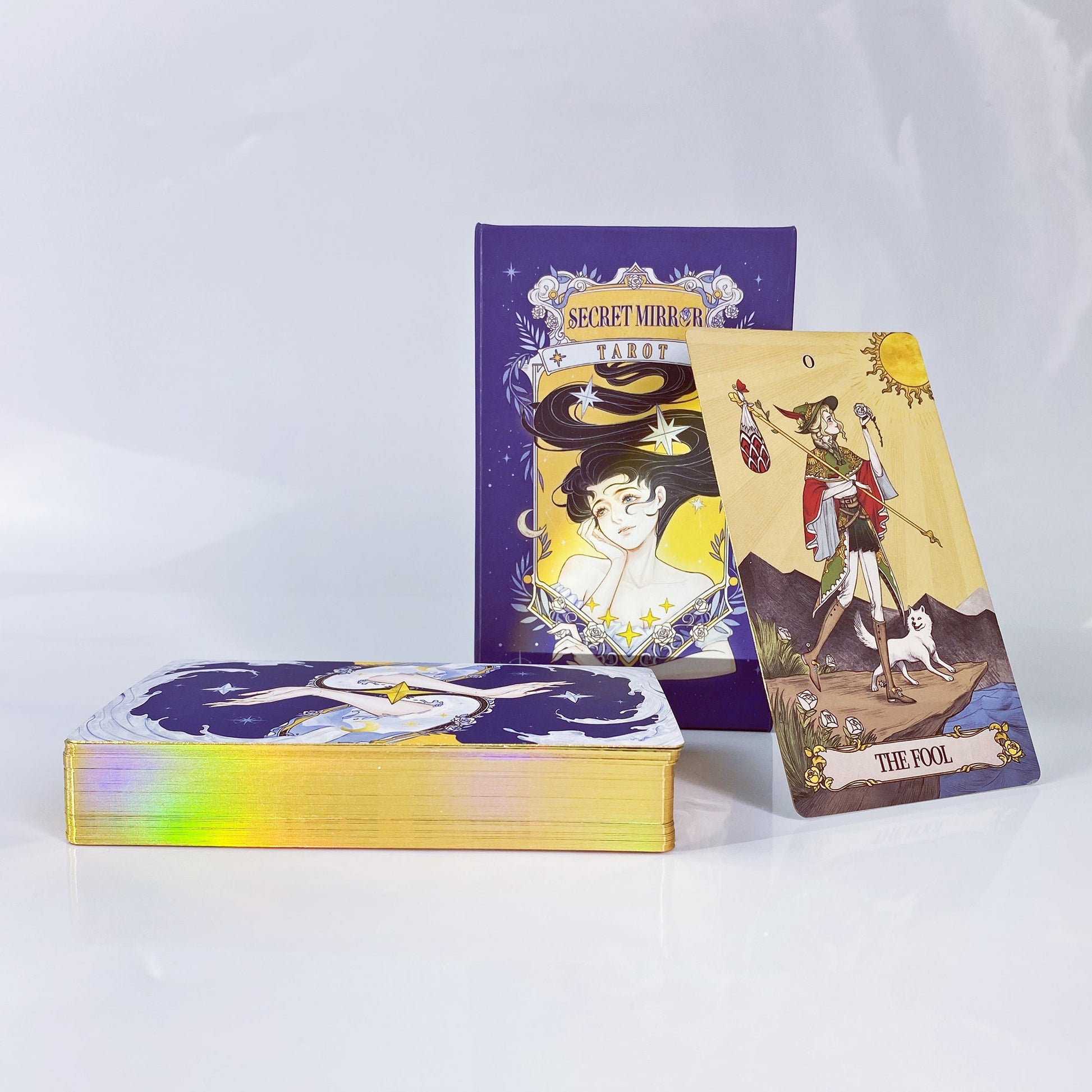 This deck's evocative imagery invites you to peer into the 'mirror of tarot,' revealing not just divinatory insights but reflections of the self, the soul, and the unseen forces that guide our fates. From commanding figure like The Emperor, adorned in armor reminiscent of a royal knight's, to The Lovers entwined in an age-old tale of passion and destiny – each card holds a story, delicate yet expressive. Finally, the artwork is designed with ornate borders and a classic palette, echoing the grandeur of historical illustrations and the mystique of medieval artistry.