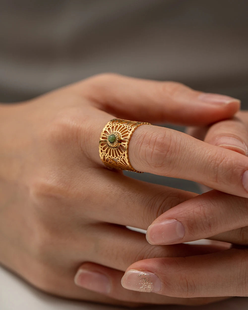 This gold ring features an intricate mandala design, symbolizing the universe and spiritual journey. At its heart lies a stunning green jasper gemstone, known for its connection to the heart chakra, Anahata. The green jasper promotes balance and tranquillity, making this ring not only a beautiful accessory but also a meaningful spiritual talisman.