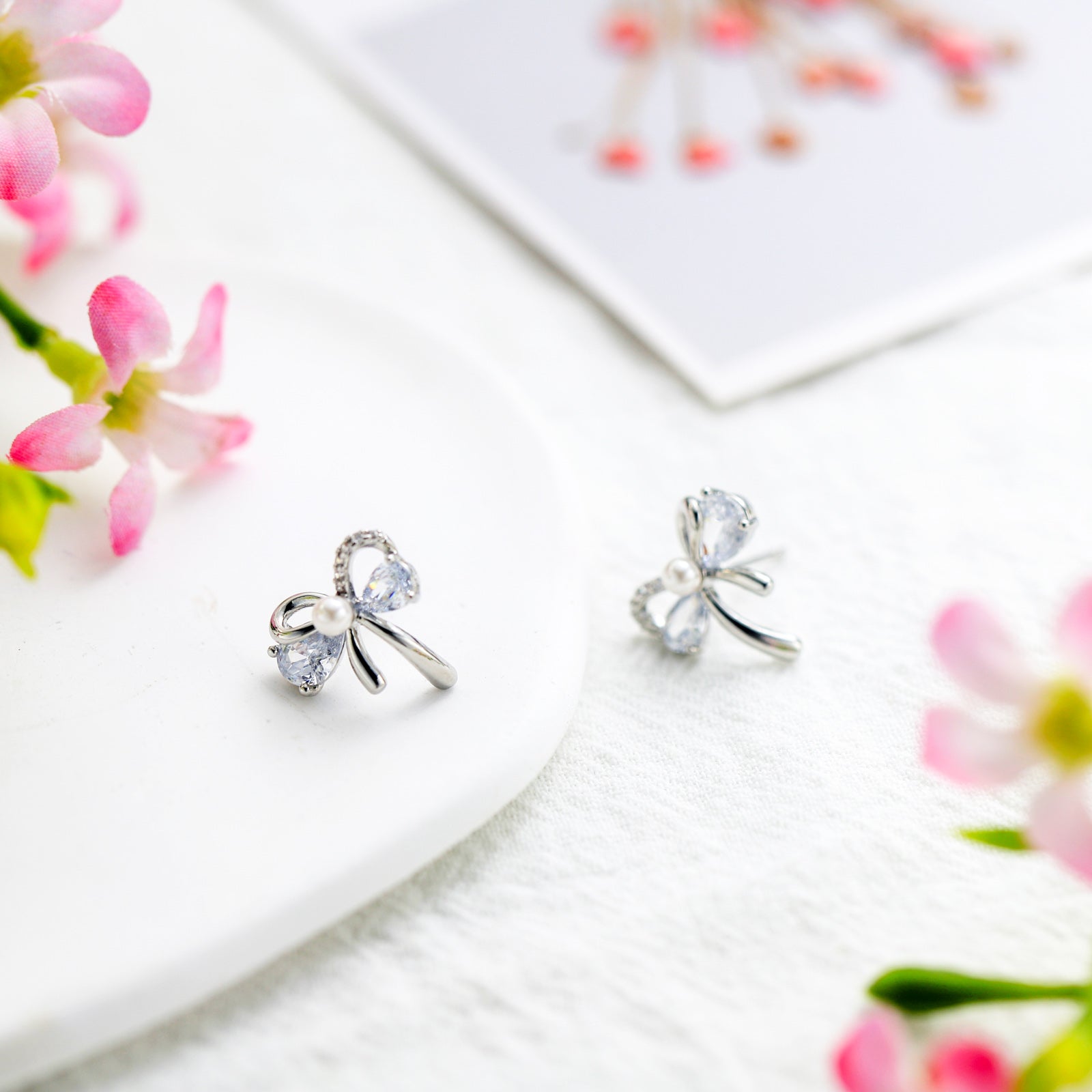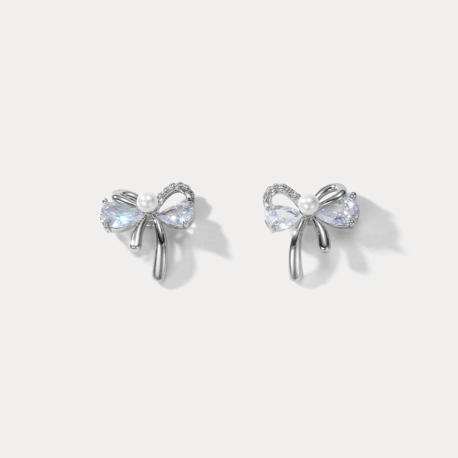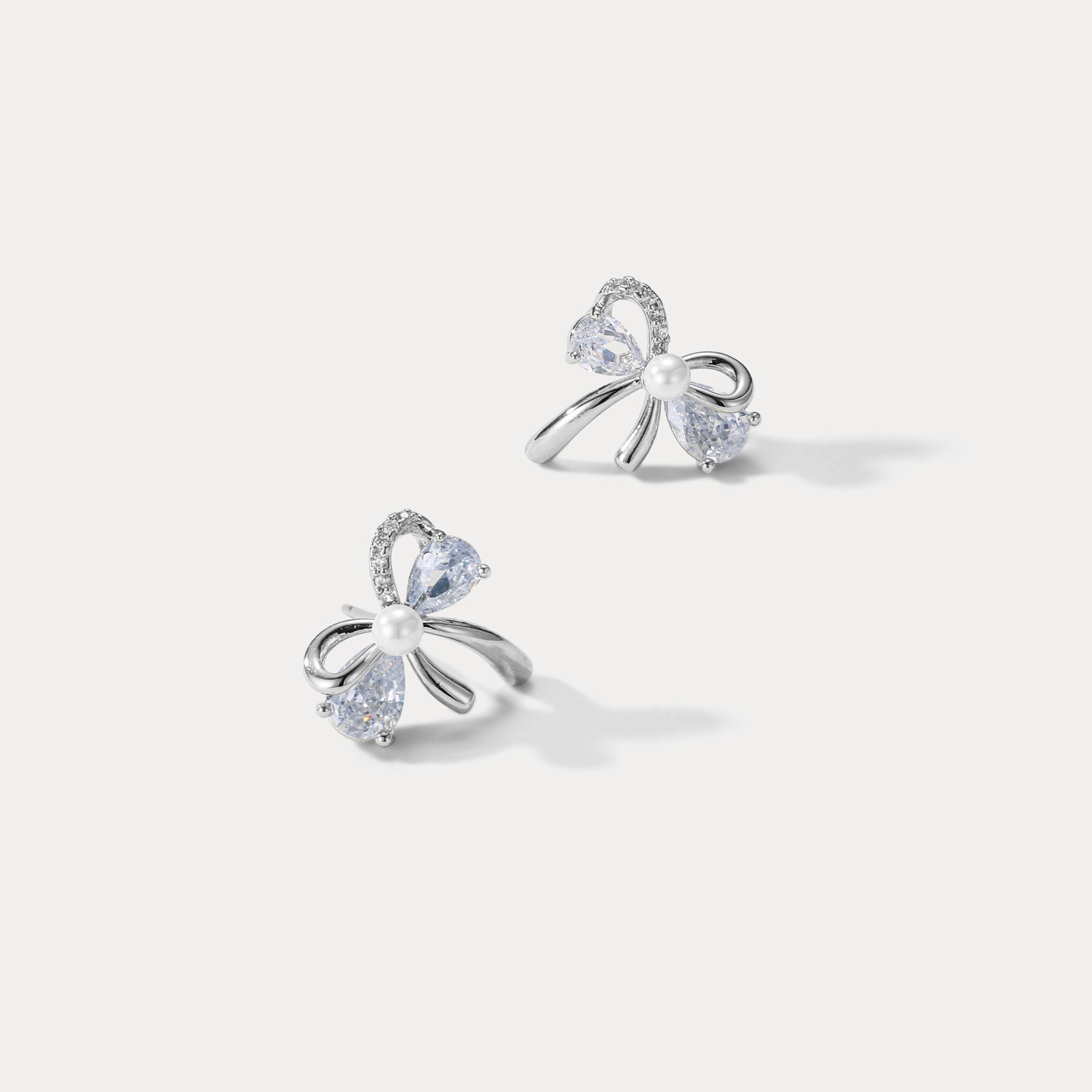 Delicate, elegant, and full of charm! These Silver Bow Earrings are crafted in platinum and adorned with sparkling cubic zirconia, bringing a refined touch to any look. Featuring a refined bow shape, the earrings blend whimsy and elegance with ease. Perfect for infusing a lasting touch of delicacy to both casual and formal outfits.