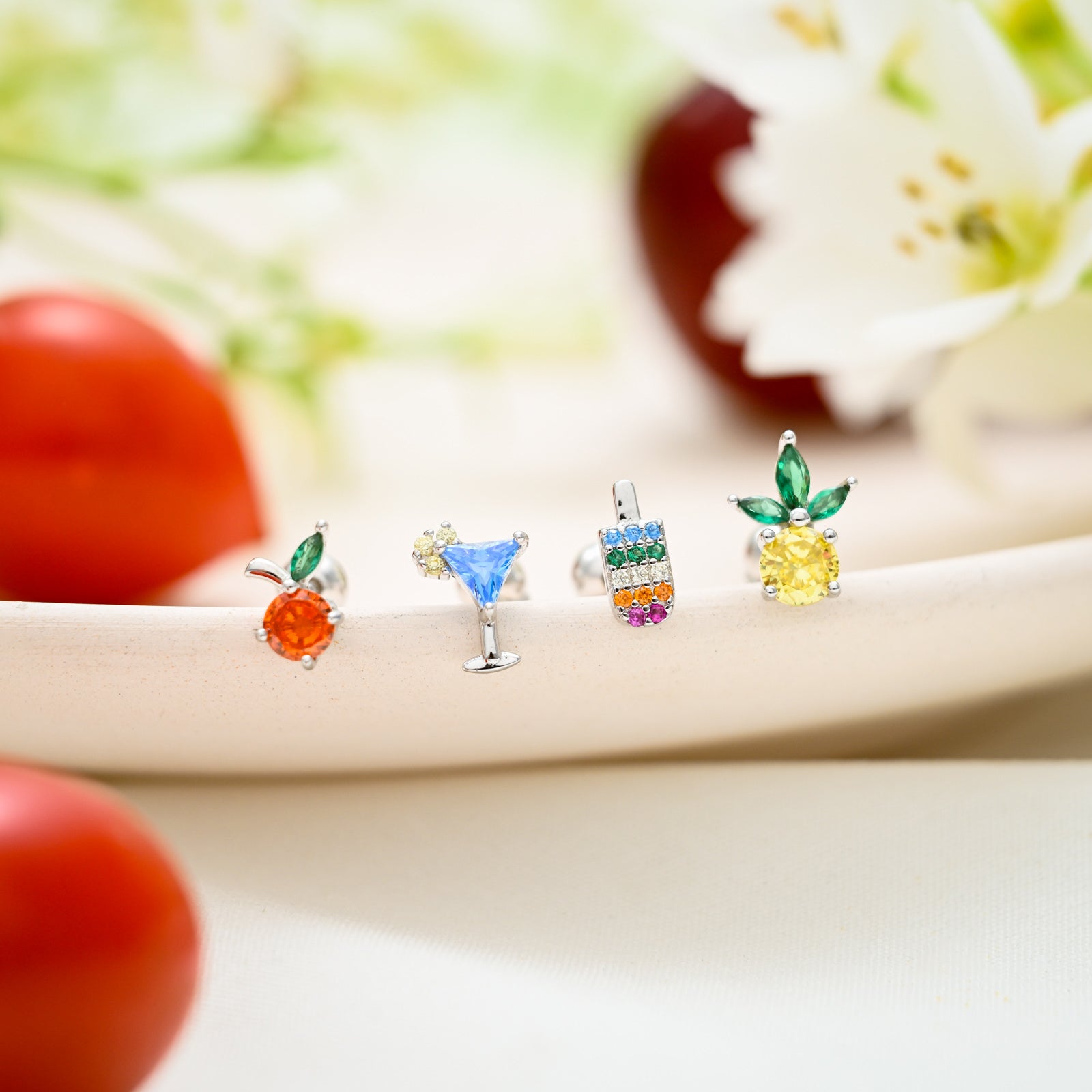 The Silver Fruit Earrings Set is a playful and vibrant collection that celebrates the joy of summer and fruity delights. Crafted from high-quality silver, this set includes four charming earrings, each featuring a unique design: a colorful popsicle, a sparkling lemon, a cheerful cherry, and a refreshing martini.
