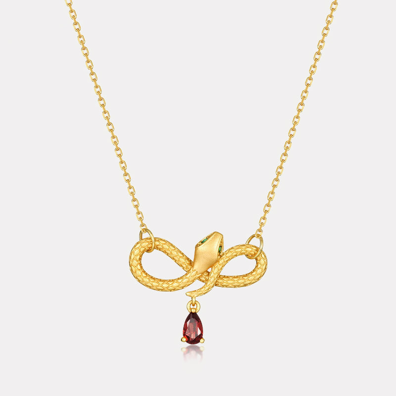 Celebrate the auspicious 2025 Snake Year in style with our enchanting Snake Zodiac Necklace, part of our Lunar New Year Jewelry Collection. A masterpiece crafted in 10K gold on silver and adorned with a striking garnet centerpiece, this necklace captures the sinuous elegance of the serpent, symbolizing wisdom, intuition, and the magnetic allure of the Snake zodiac sign. Every curve and scale is meticulously detailed, reflecting the snake's mesmerizing grace and mystery.