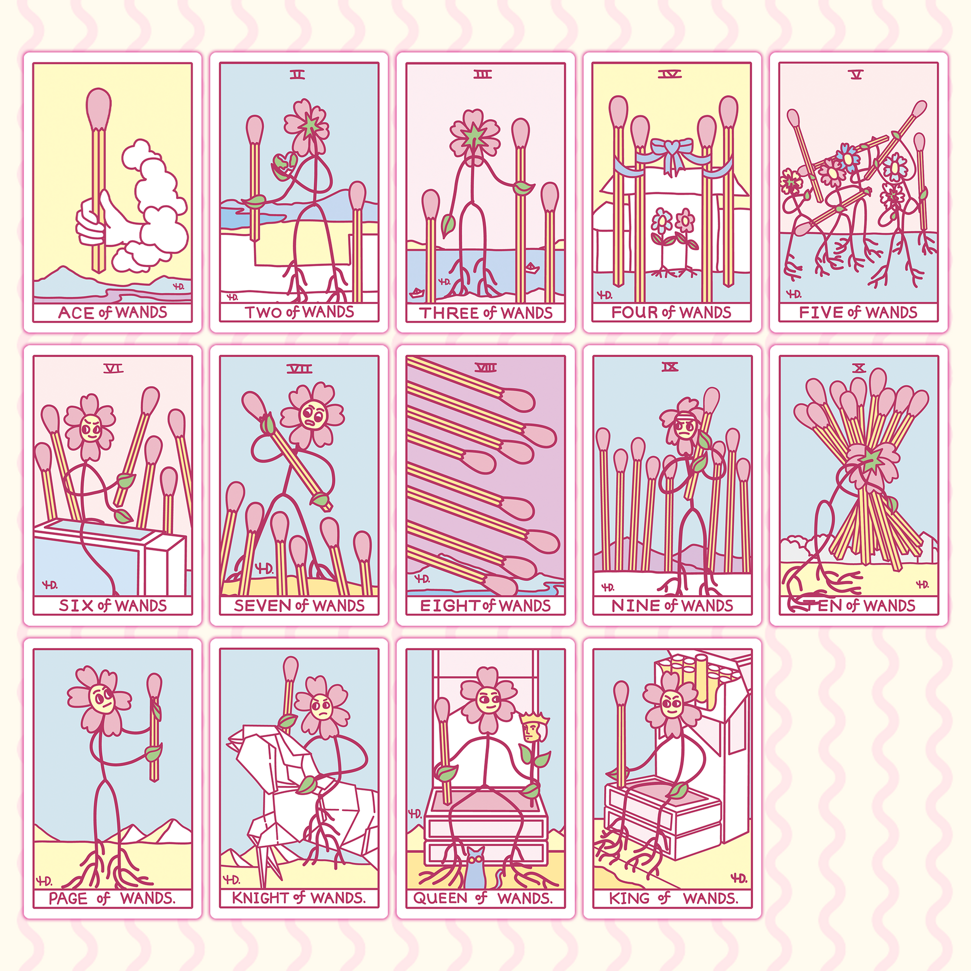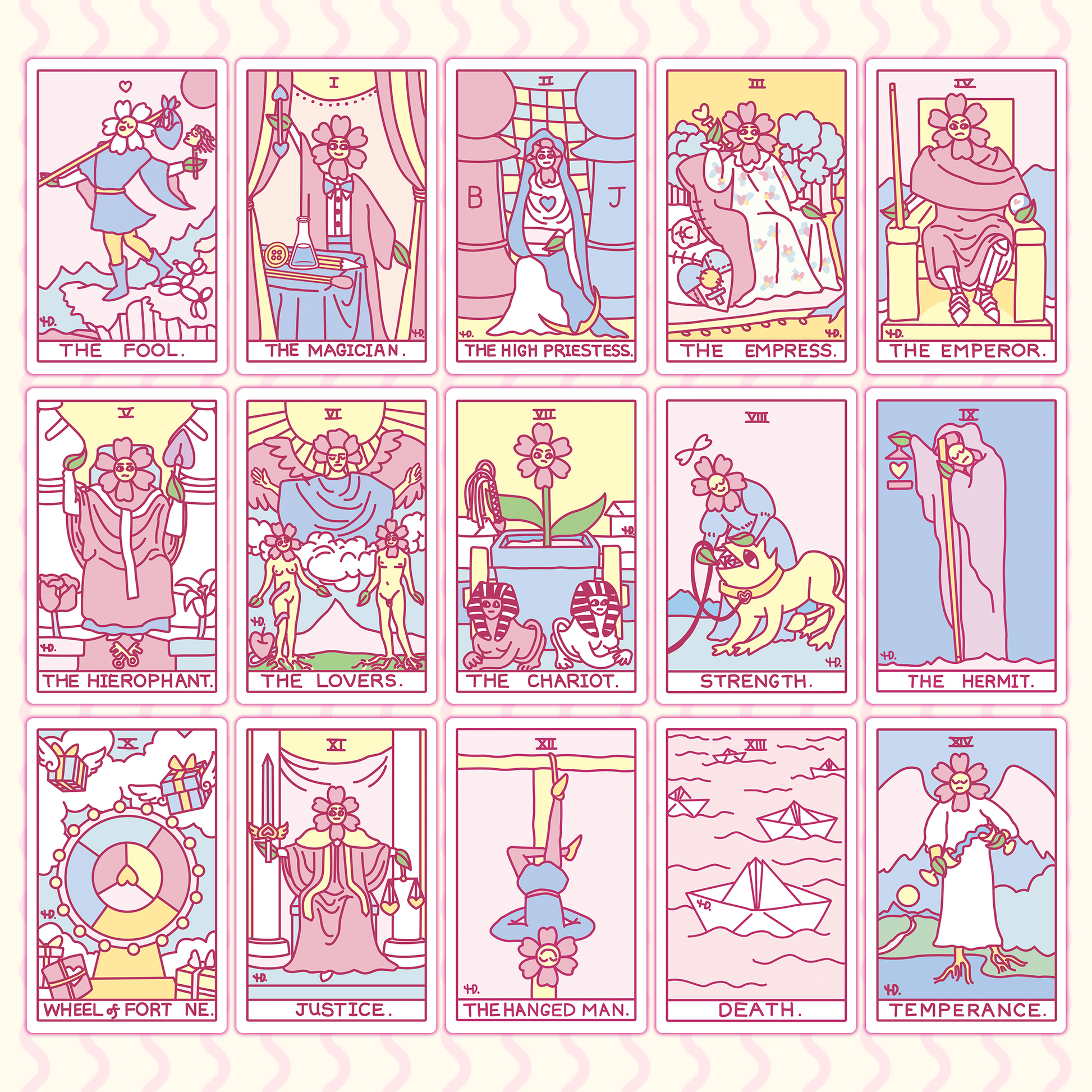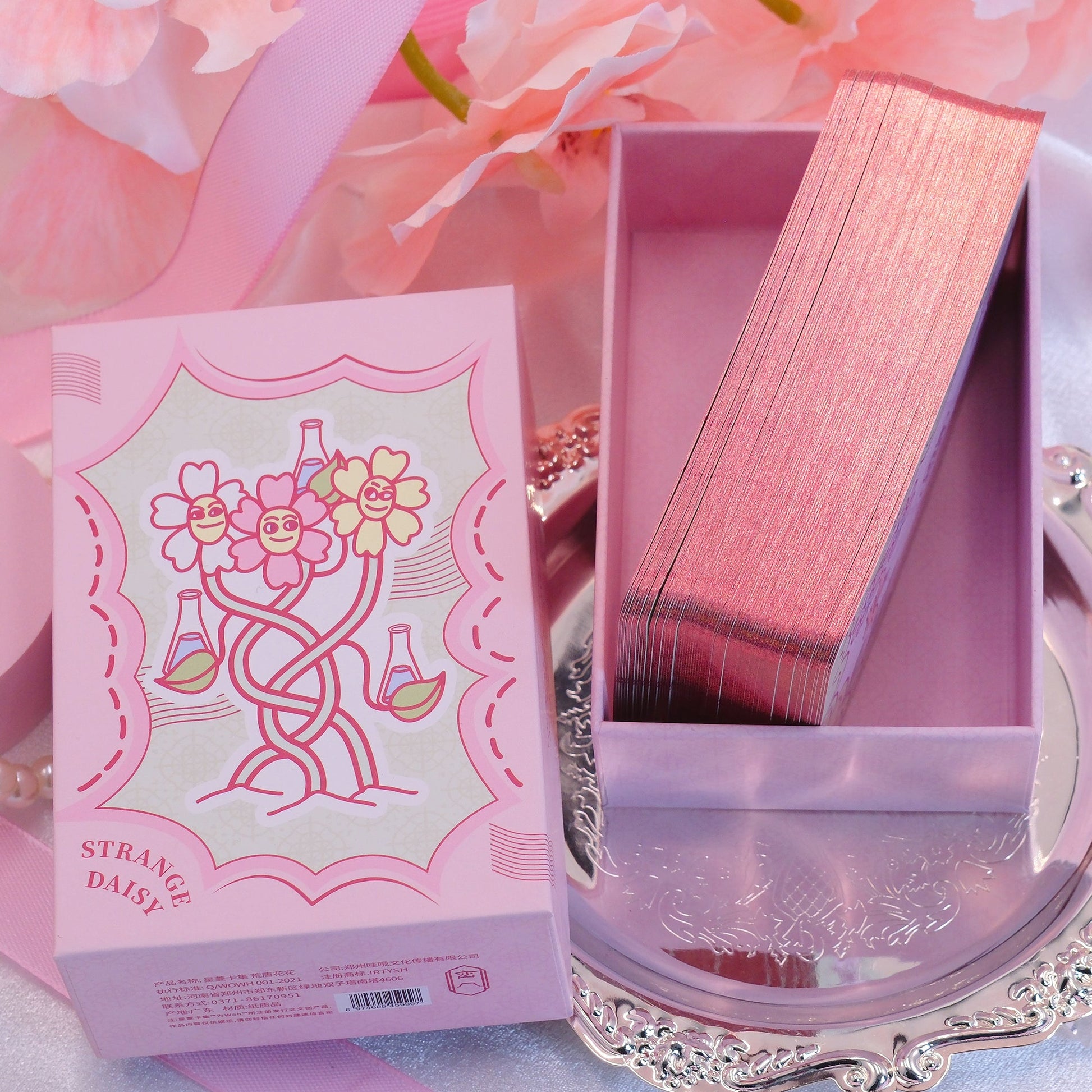 As you open the tarot box, you enter a vibrant realm awash in pink and blue. Strange Daisy and its playful friends wiggle in the breeze, relishing love in nature's generous embrace. Likewise, this deck will provide you with the freedom of imagination, small doses of enlightenment, and long-lasting peace of the mind.
