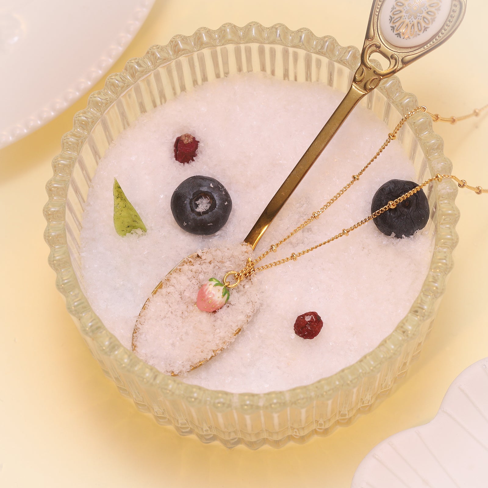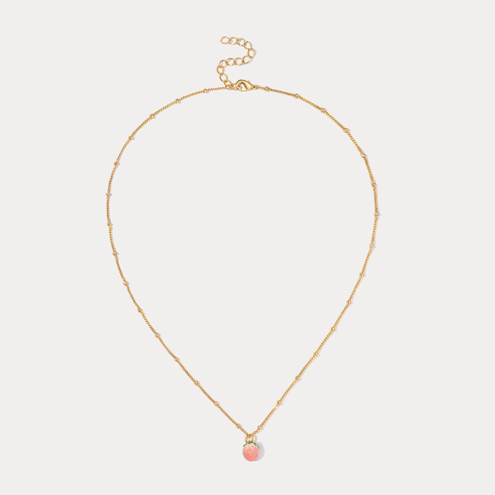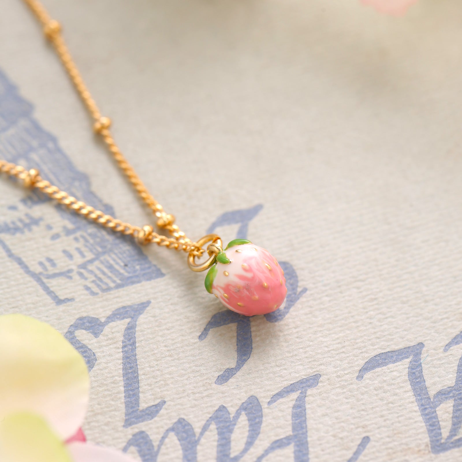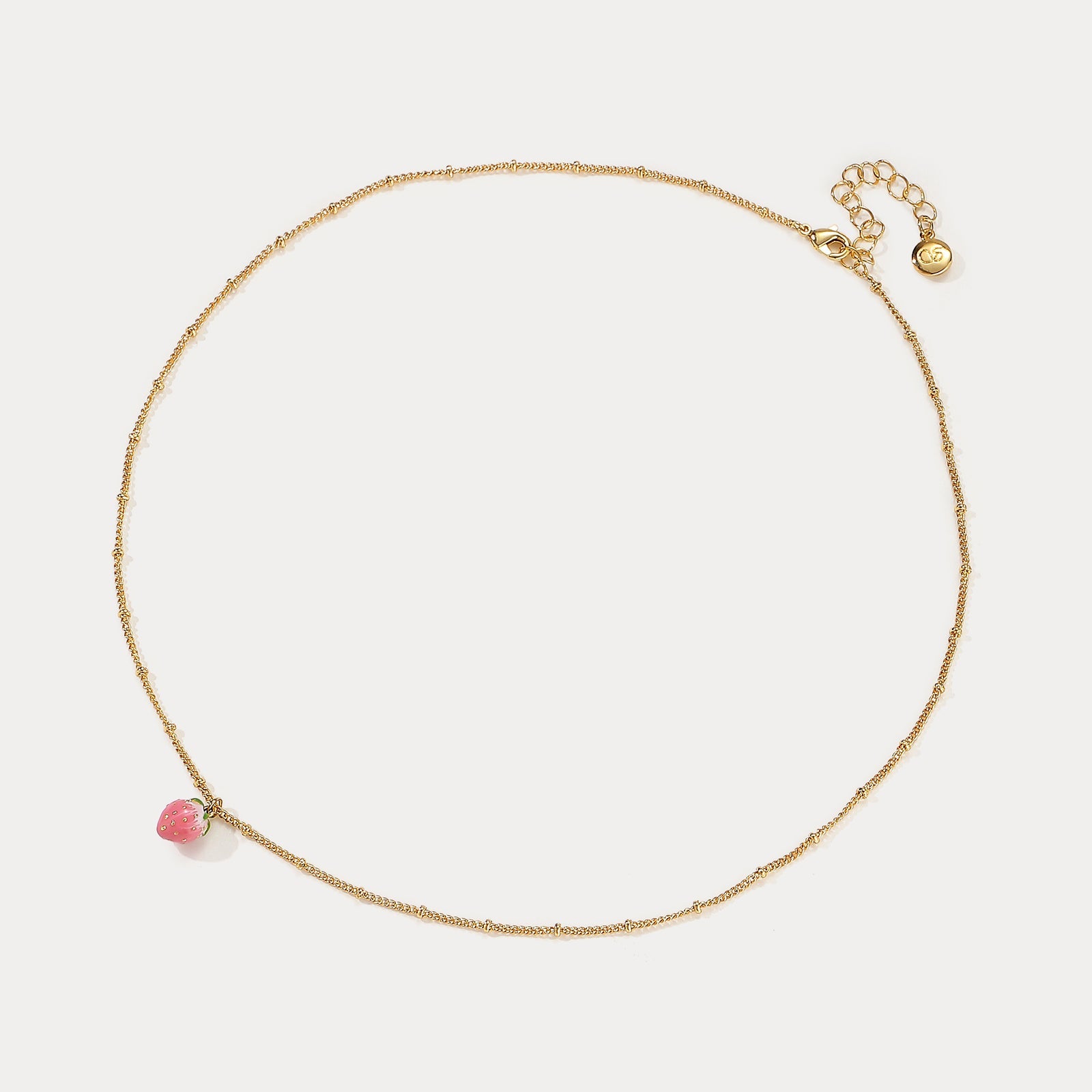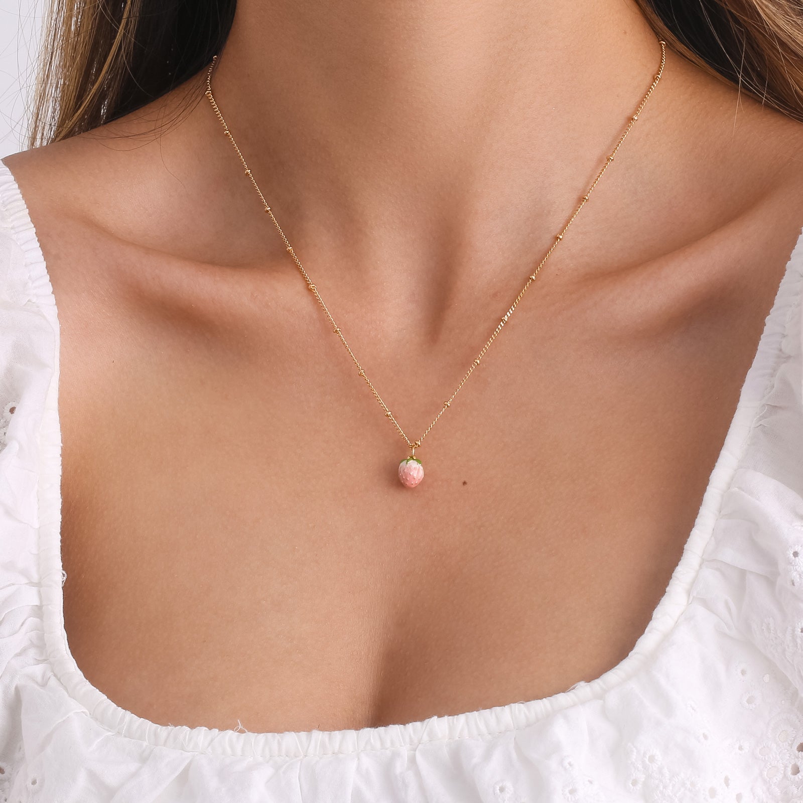 Add a touch of sweet elegance to your ensemble with the Strawberry Necklace, a delightful piece that captures the charm of nature's bounty. This strawberry pendant necklace features a beautifully crafted strawberry pendant, adorned with vibrant enamel detailing. The strawberry, symbolizing love and happiness, brings a whimsical yet sophisticated flair to your jewelry collection. Perfect for layering or wearing as a standalone statement piece, the gold strawberry necklace effortlessly enhances any outfit, making it ideal for both everyday wear and special occasions. Celebrate the joy and beauty of nature with this enchanting accessory that is sure to become a cherished favorite.