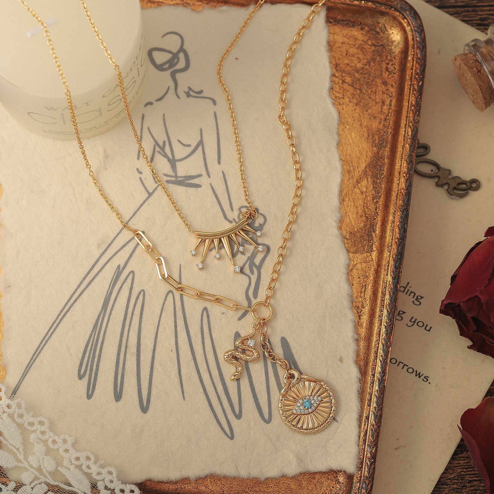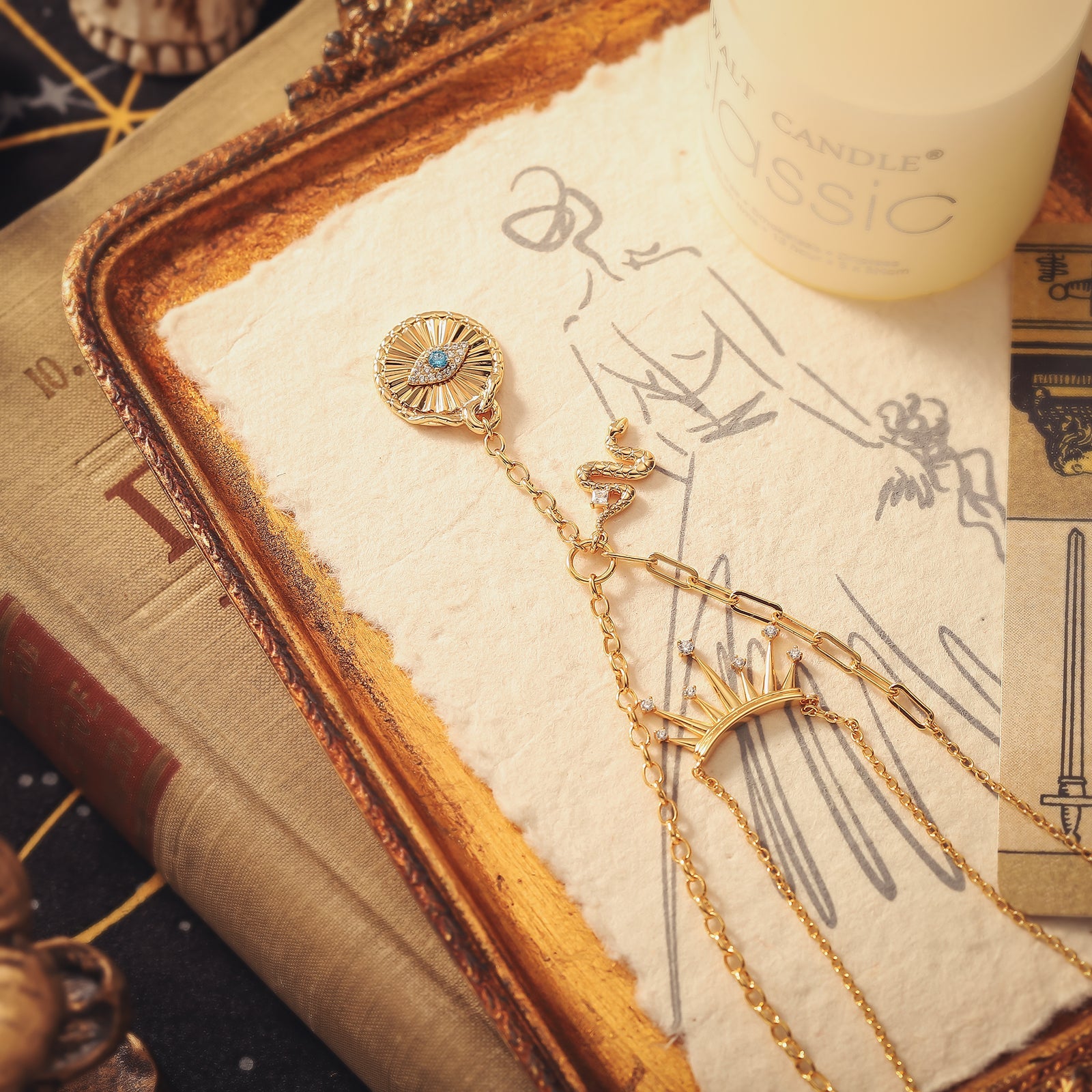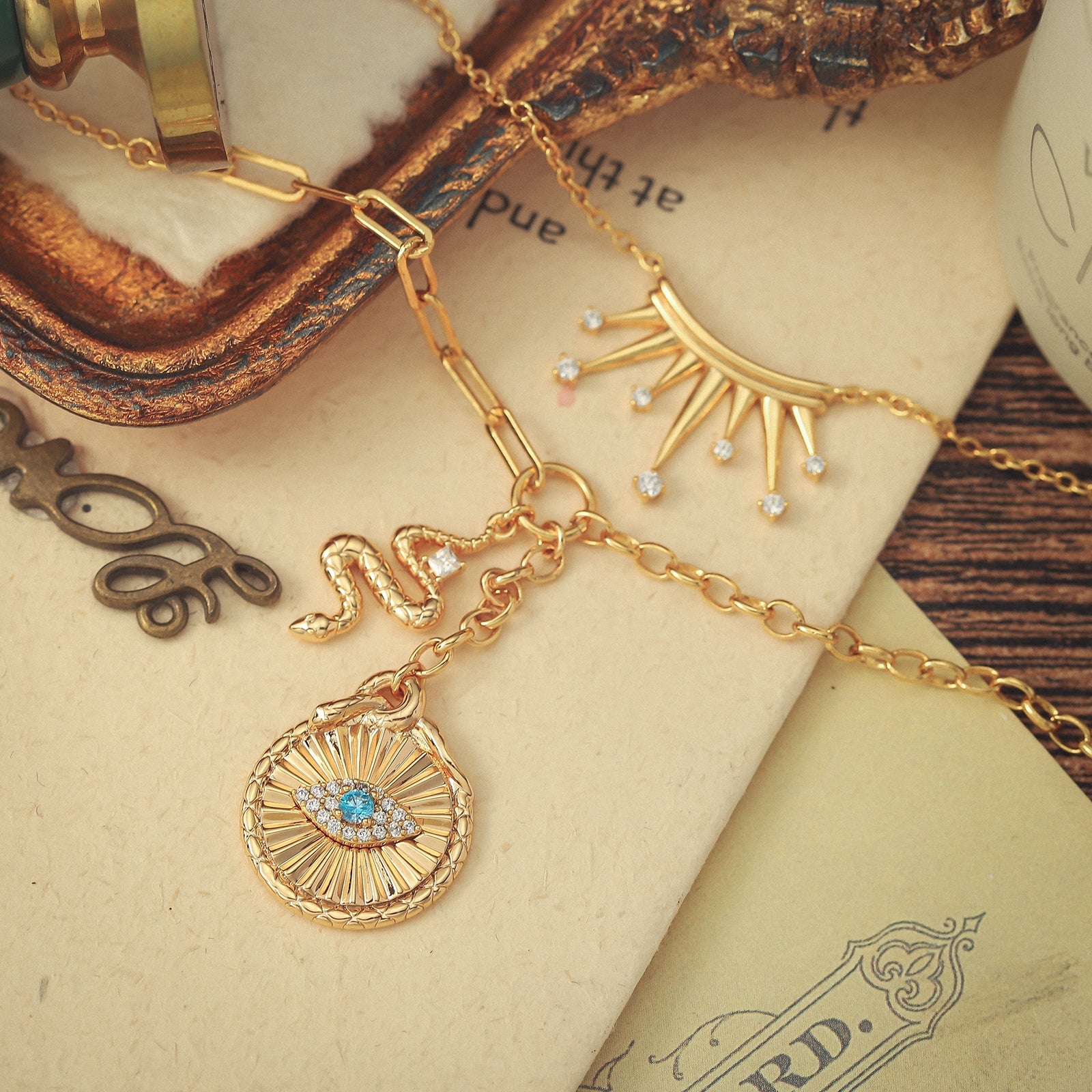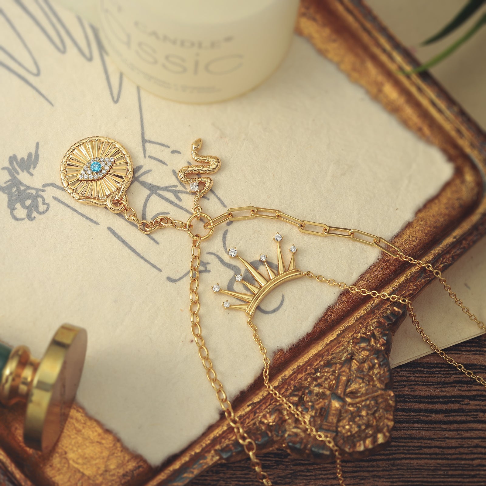 Channel celestial protection with our Talisman Evil Eye Crown Layered Necklace, a talisman of strength and serenity. This captivating piece features an Evil Eye pendant delicately suspended from multiple layers, symbolizing karma and luck. This stunning accessory not only adds a touch of style to any outfit, but also serves as a talisman against negative energy and harm. Stay confident, chic, and protected with our necklace. 🐍👁️
