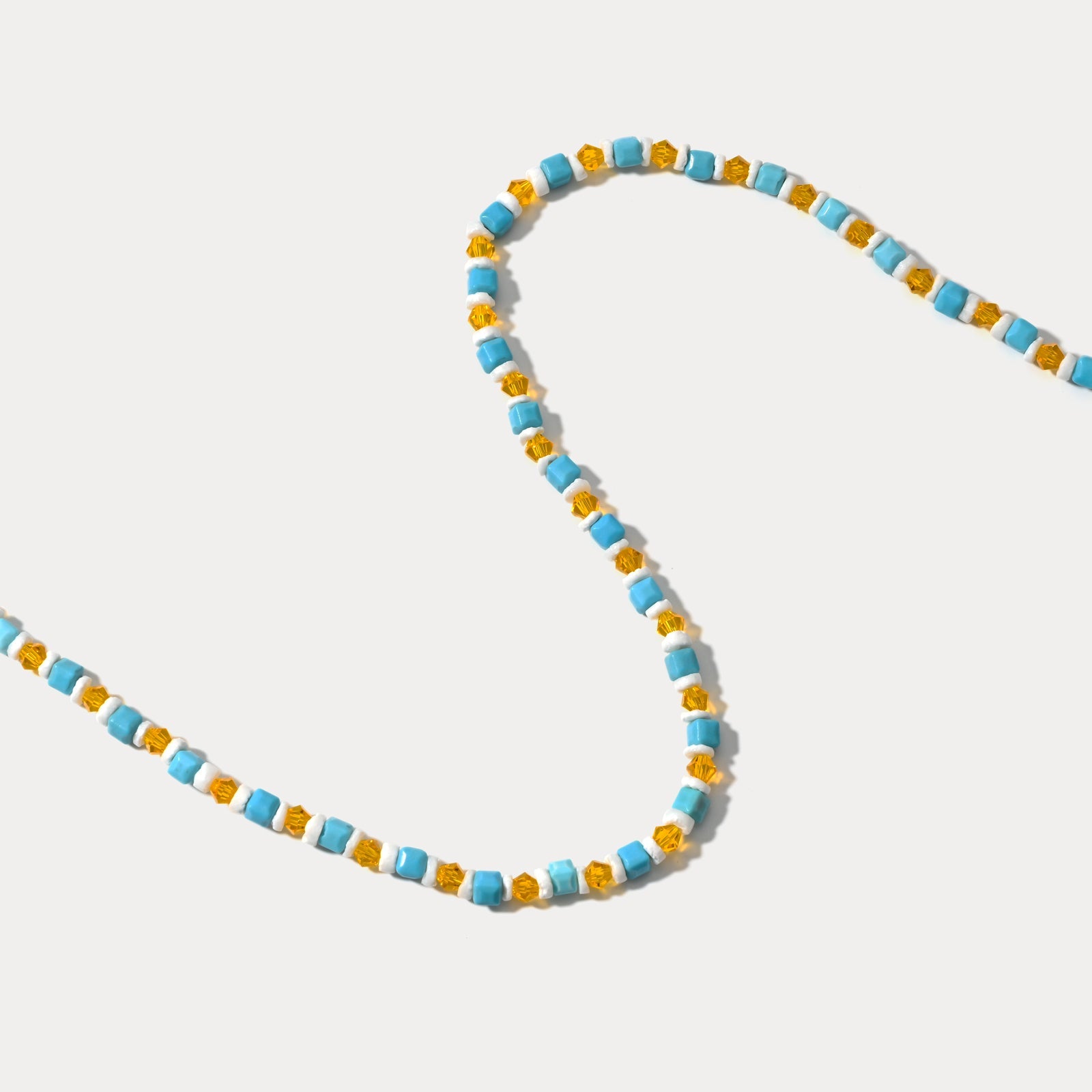 Radiate the sun-kissed radiance of summer with the Dainty Citrine Turquoise Bead Necklace, a dainty turquoise necklace that exudes warmth and charm. Made with platinum-plated brass accents, this delicate piece features luminous citrine beads harmoniously paired with vibrant turquoise stones, accented by glistening quartz and sparkling crystals. A captivating symphony of earthy hues and shimmering accents, this boho turquoise necklace infuses any warm-weather ensemble with a bohemian flair, allowing you to bask in the carefree spirit of the season with effortless elegance.
