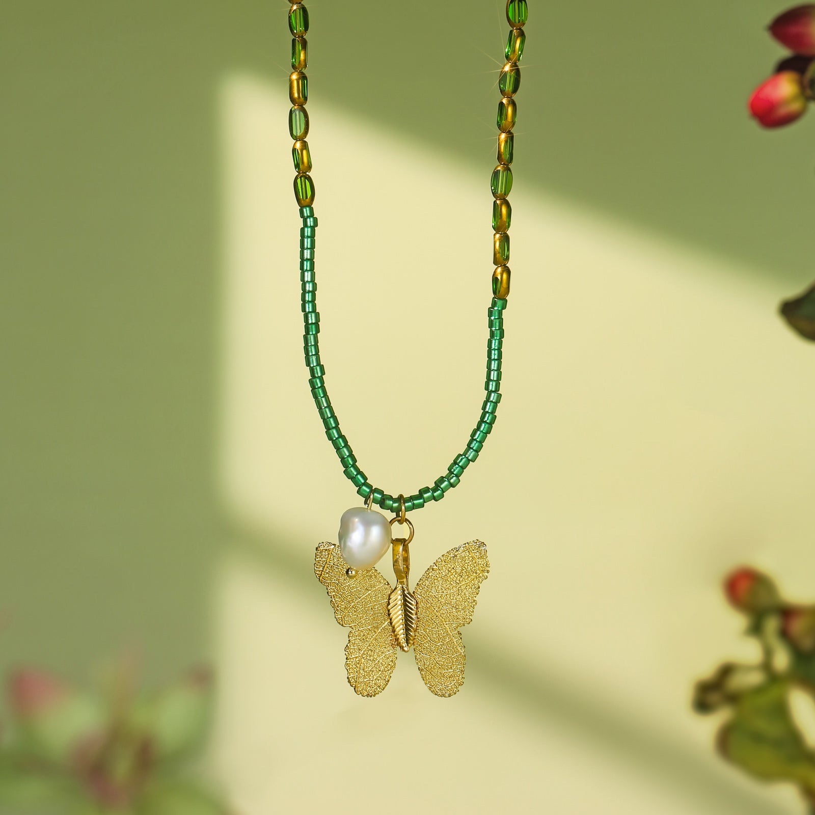 Blending vintage romance with the lively spirit of nature, this Vintage Gold Butterfly Bead Necklace features a gradient of green beads that interweave like spring vines, accented with lustrous pearls for a soft gentle touch. The gold butterfly pendant stands out with delicate textures that mimic the veins of butterfly wings, radiating a timeless vintage charm. Lightweight and comfortable to wear, this butterfly pearl necklace adds an artistic flair to simple outfits and complements retro inspired looks. Whether strolling through the streets or attending a literary gathering, the gold butterfly necklace feels like letting a butterfly rest gracefully at your neck, quietly weaving the poetry of vintage beads into your everyday life and expressing distinctive taste.