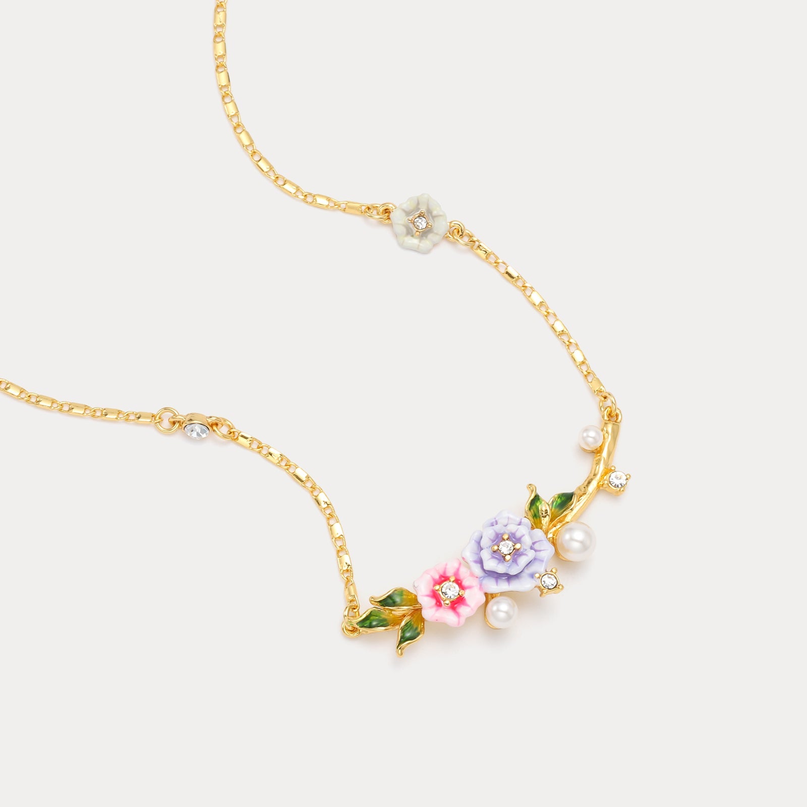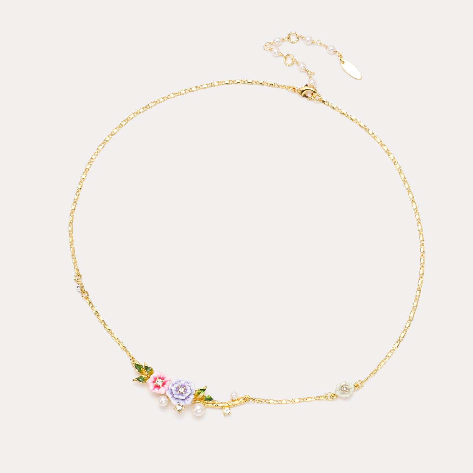 Celebrate life's simple pleasures with the enchanting Wild Rose Necklace, rendered in radiant gold-plating. Delicate rose buds unfurl along the delicate chain, their intricate petals glistening with pearl dewdrops. This botanical treasure captures nature's untamed beauty, blossoming with light-hearted charm. Wear it as a cherished reminder to embrace the free-spirited allure of each day.