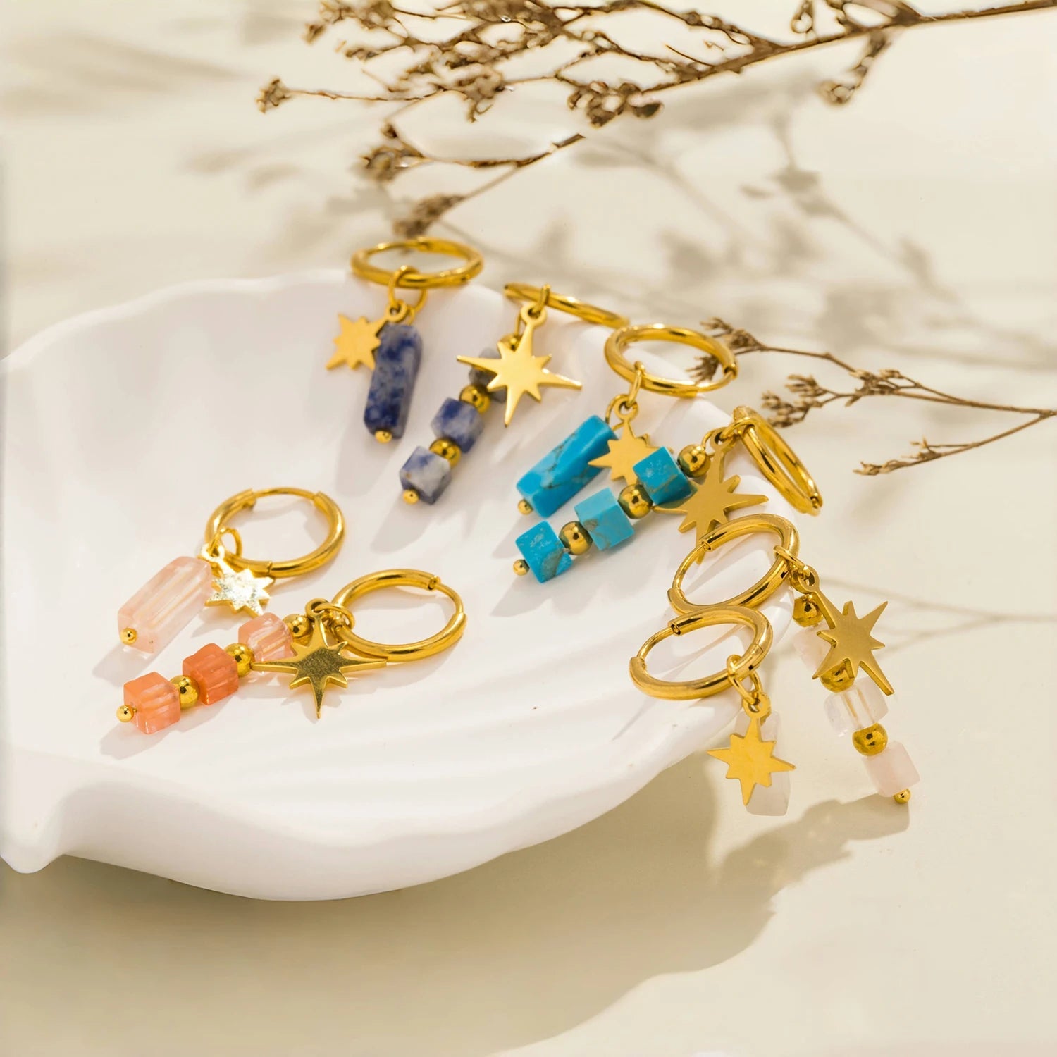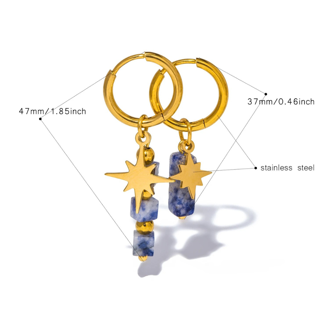 These celestial hoops pair golden stars with healing stones, each one chosen for its energy and beauty. Lightweight, waterproof, and made to shine through everyday magic.