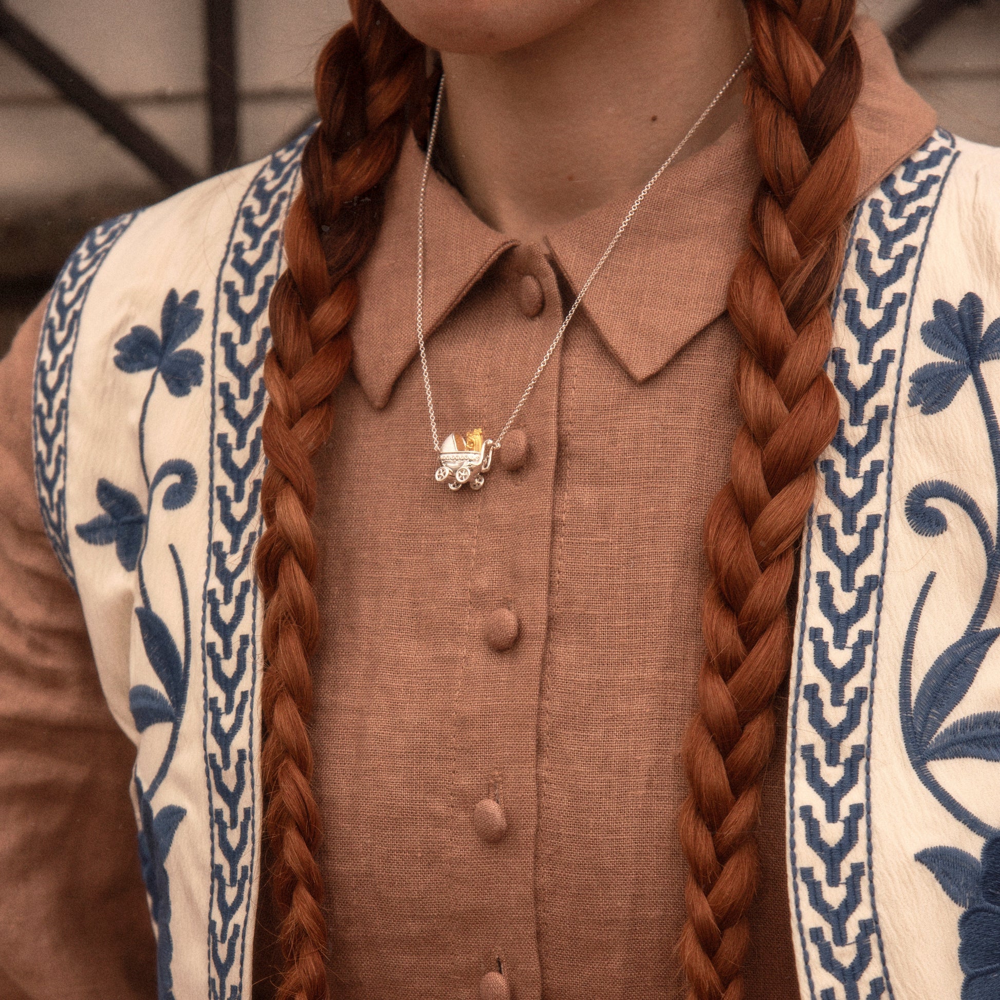 Holding our Yorkshire Terrier Pram Necklace, a whimsical and adorable accessory for dog lovers. This necklace features a Yorkshire Terrier riding in a pram, showcasing the playful and endearing nature of these charming companions. Wear it as a delightful expression of your love for Yorkshire Terriers and add a touch of canine charm to your style. Perfect for those who cherish the joy of furry friendships.